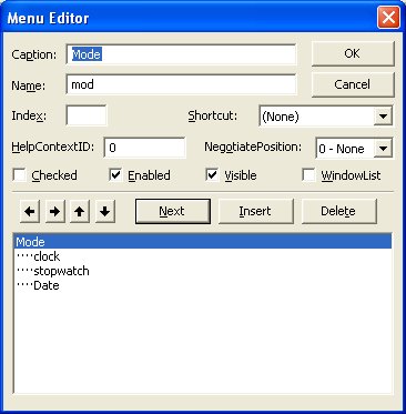 We can design a stopwatch that resembles a typical digital stopwatch. When the user clicks mode, he or she can select clock, date or stopwatch. When he or she select clock, the current time is displayed and when date is selected, the current date will be displayed. Lastly, when the user select the stopwatch, all the digits will be set to 0. In this program, you need to insert one label, three command buttons and two timers. Timer1 is used for the stopwatch so we set the interval to 1(1000th of a second). Timer2 is used to display the clock so we set the interval to 1000(equivalent to 1 second). We also used six string variables to display the digits of the stopwatch so that we can put in the colons ":" and the decimal point. We have also created a subroutine known as countime. To add the menu items to the interface, you need to add them from the menu editor, as shown in the Figure below: