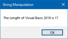 Private Sub Button1_Click(ByVal sender As System.Object, ByVal e As System.EventArgs) Handles Button1.Click Dim MyText as String MyText="Visual Basic 2019" MsgBox("The Length of" & MyText & "is" & Len(MyText)) End Sub