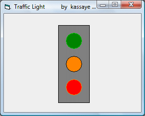 This is a traffic light simulator that works like the actual traffic lights. It can be programmed fairly easily using Visual Basic 6. In this program, you have to insert one timer and set its interval to any figure. Here we set it to 3000, which is equivalent to 3 seconds. Next you insert three shapes and set their shape properties to circle and fill them with three colors, green, amber (or yellow) and red. Use the following code to set one color on and the other two colors off:
